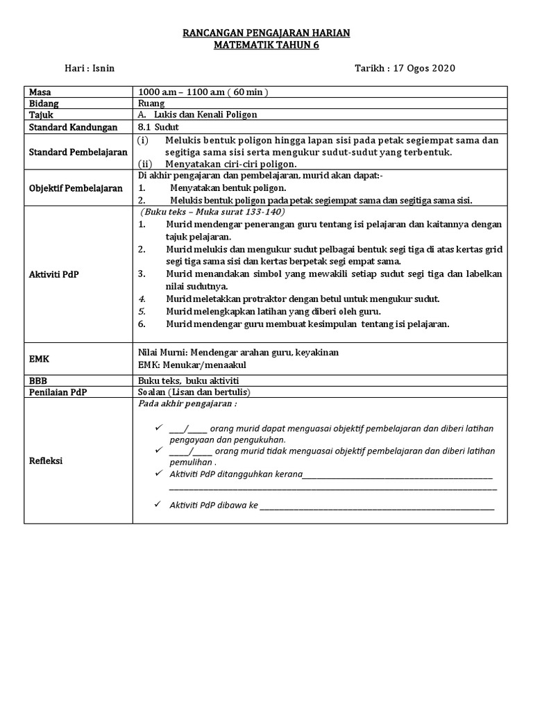 Di akhir pengajaran dan pembelajaran, murid akan dapat:-