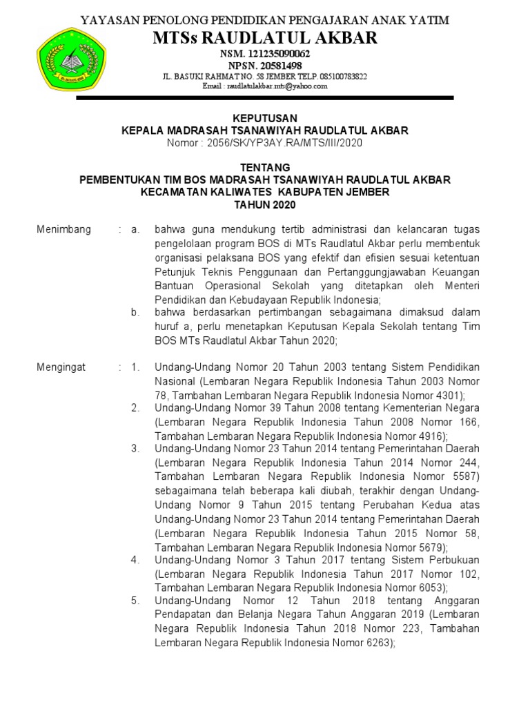 Kesatu : Membentuk Tim BOS MTs Raudlatul Akbar Tahun Anggaran 2020.