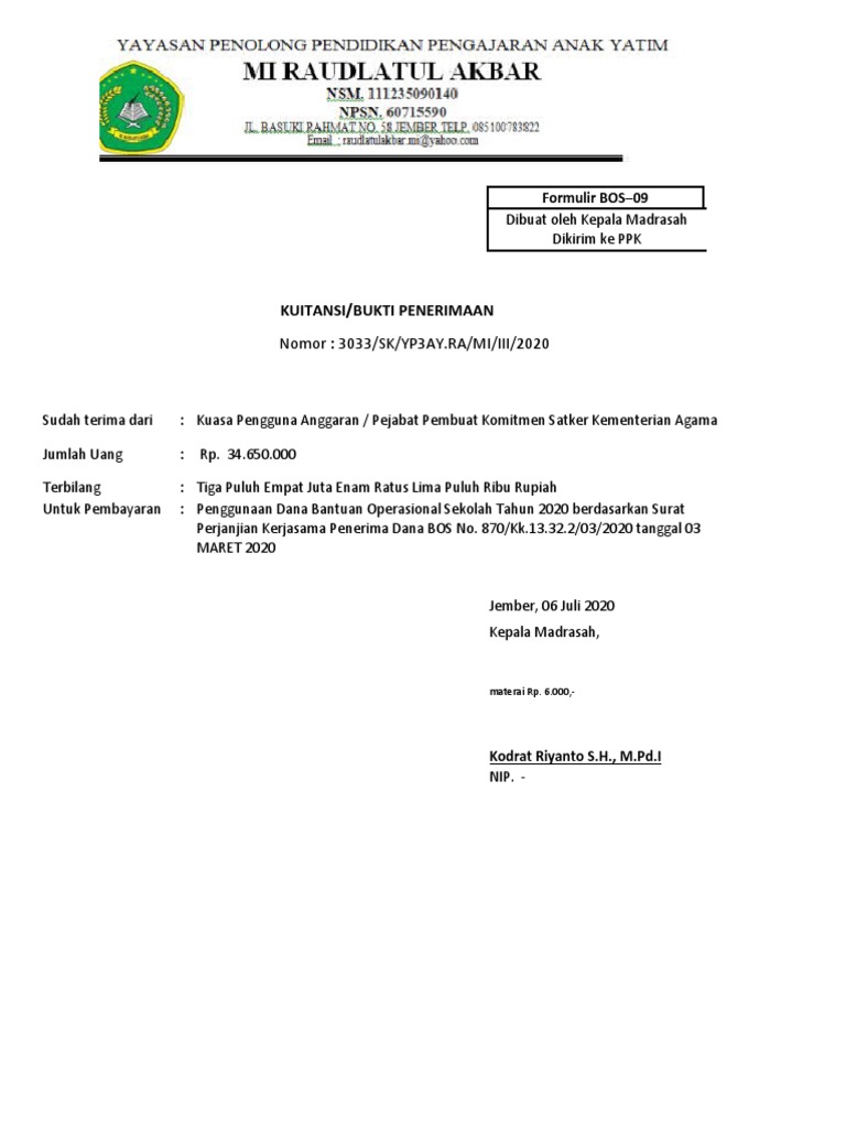 Perjanjian Kerjasama Penerima Dana BOS No. 870/Kk.13.32.2/03/2020 tanggal 03