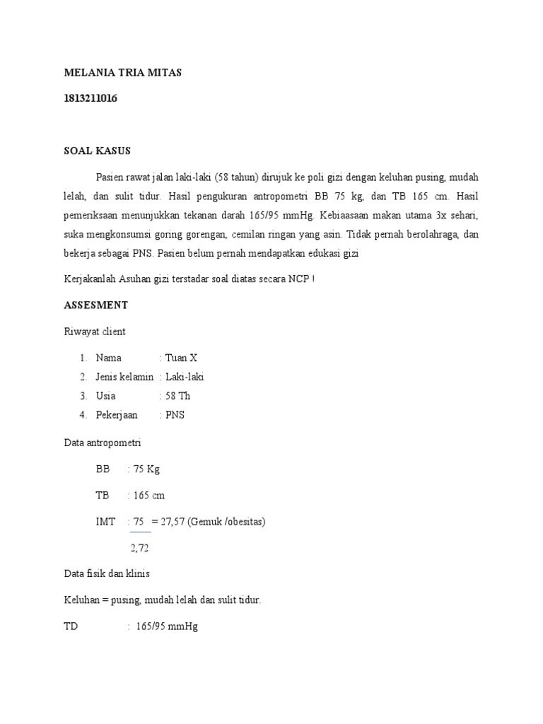 Kerjakanlah Asuhan gizi terstadar soal diatas secara NCP !