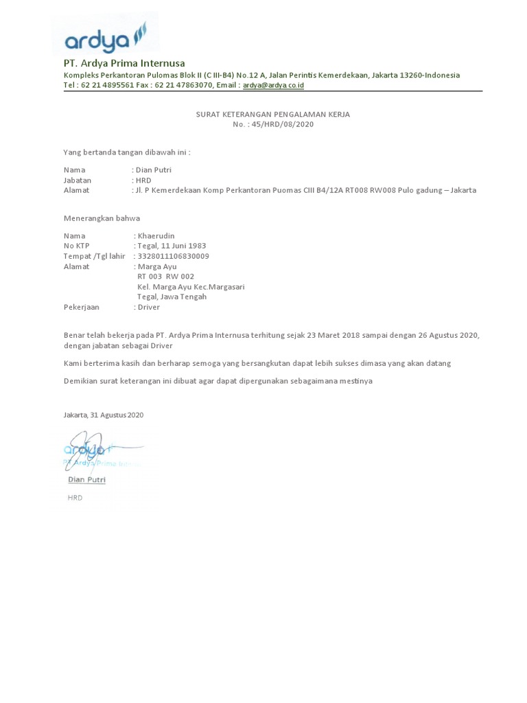 Benar telah bekerja pada PT. Ardya Prima Internusa terhitung sejak 23 Maret 2018 sampai dengan 26 Agustus 2020,