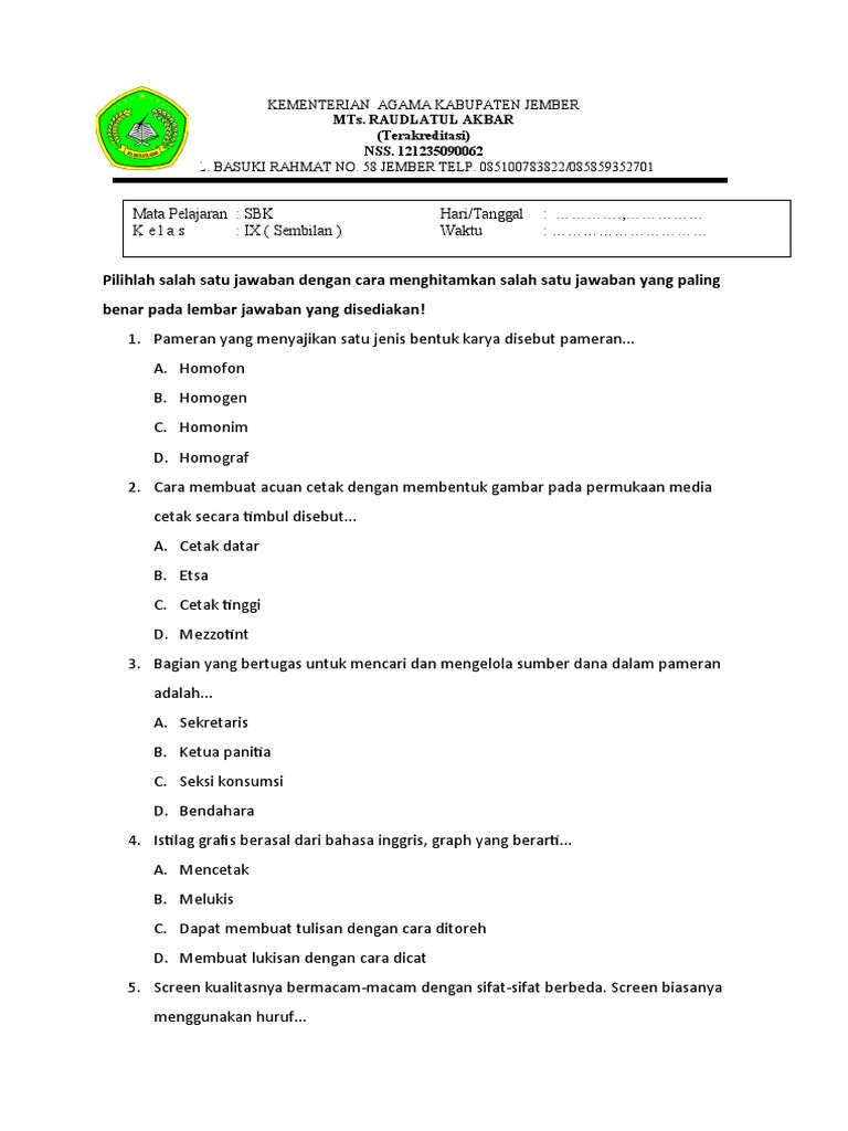 Kelas : IX ( Sembilan ) Waktu : …………………………