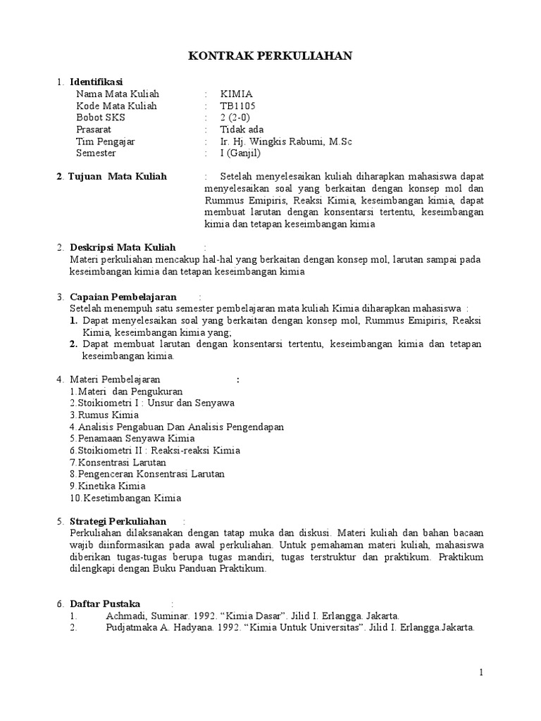Diskripsi Singkat MK Materi perkuliahan mencakup hal-hal yang berkaitan dengan konsep mol, larutan sampai pada keseimbangan kimia dan