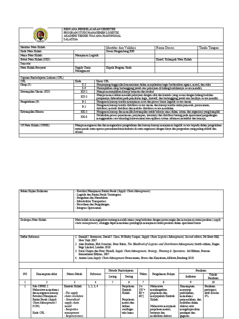 Deskripsi Mata Kuliah Mata kuliah ini mengajarkan tentang masalah utama yang berkaitan dengan perancangan dan menejemen rantai pasokan (supply