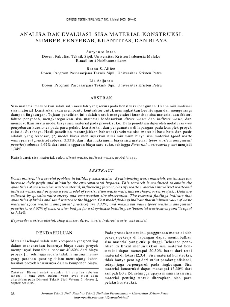 ANALISA DAN EVALUASI SISA MATERIAL KONSTRUKSI: SUMBER PENYEBAB, KUANTITAS, DAN BIAYA (Suryanto Intan, et al)