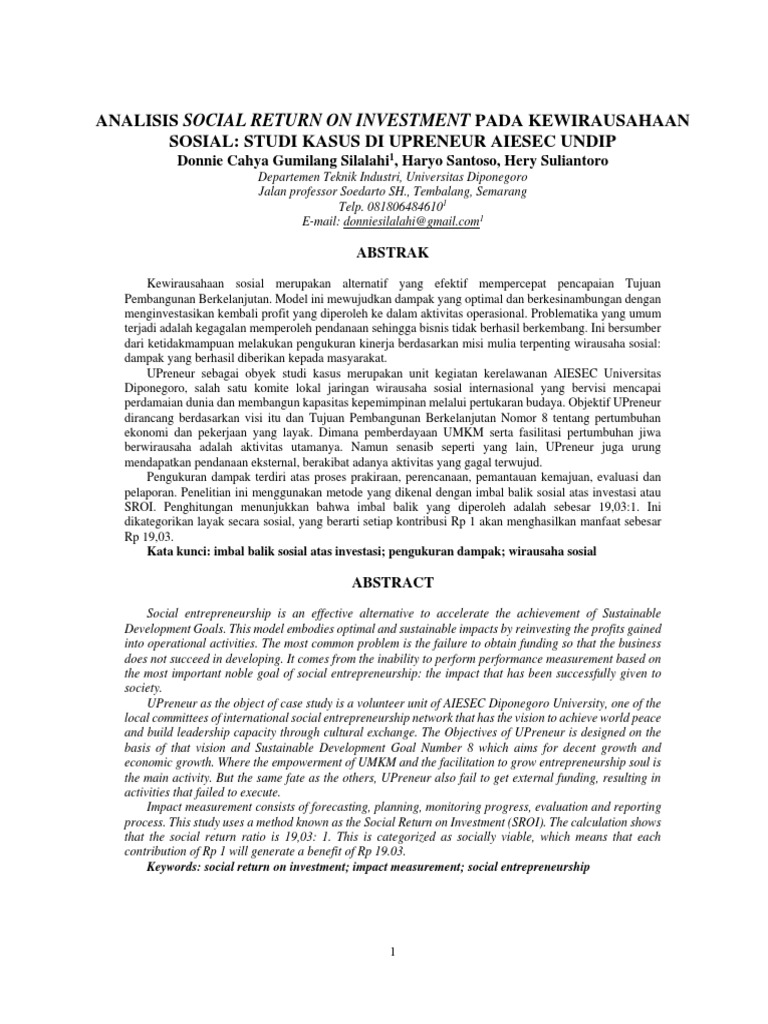 Kata kunci: imbal balik sosial atas investasi; pengukuran dampak; wirausaha sosial