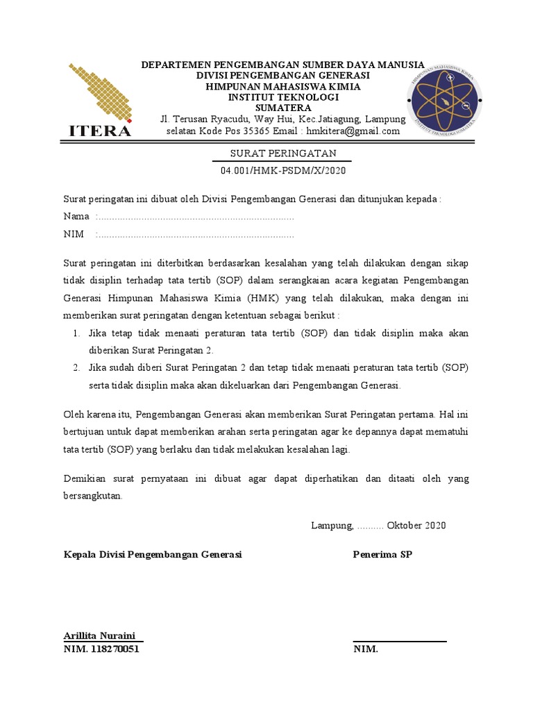 Surat peringatan ini dibuat oleh Divisi Pengembangan Generasi dan ditunjukan kepada :