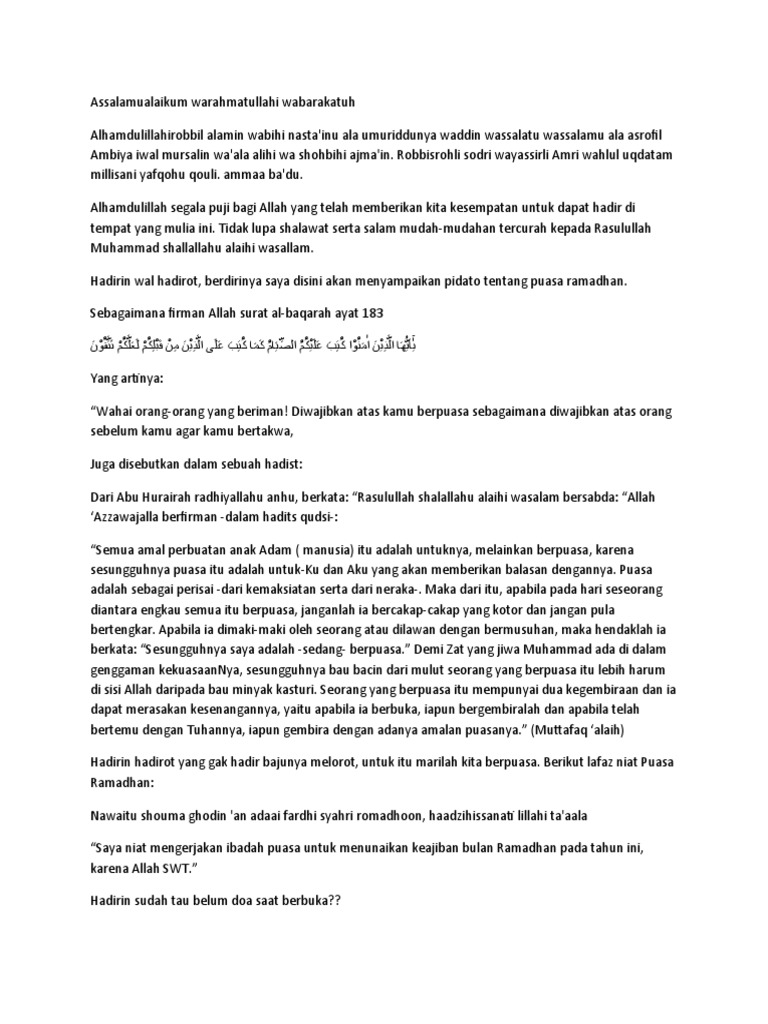 Hadirin wal hadirot, berdirinya saya disini akan menyampaikan pidato tentang puasa ramadhan.