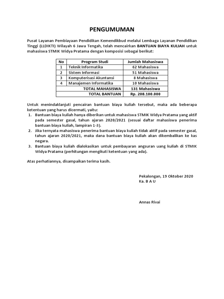 1. Bantuan biaya kuliah hanya diberikan untuk mahasiswa STMIK Widya Pratama yang aktif