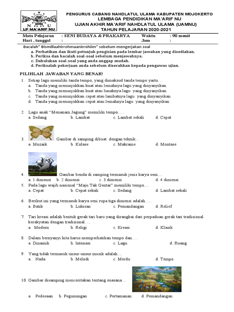 Mata Pelajaran : SENI BUDAYA & PRAKARYA Waktu : 90 menit