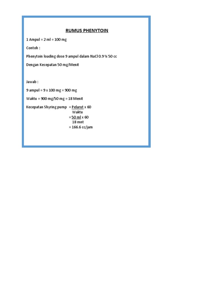 Dokumen ini memberikan informasi tentang rumus dan contoh penghitungan dosis phenytoin loading dalam NaCl 0.9% dengan kecepatan infus 50 mg/menit. Dosis phenytoin loading yang dihitung adalah 900 mg yang diberikan selama 18 menit dengan kecepatan infus 166.6 cc/jam.