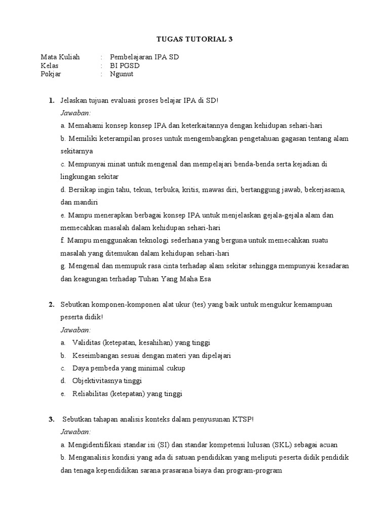 1. Jelaskan tujuan evaluasi proses belajar IPA di SD!