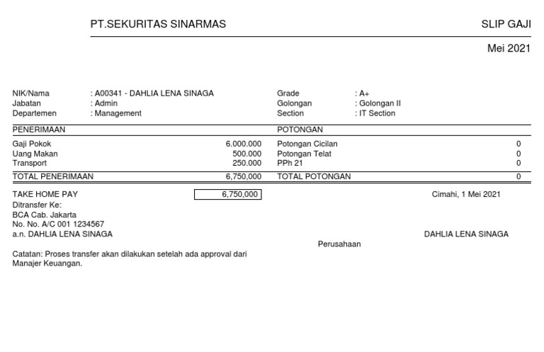 TAKE HOME PAY 6,750,000 Cimahi, 1 Mei 2021