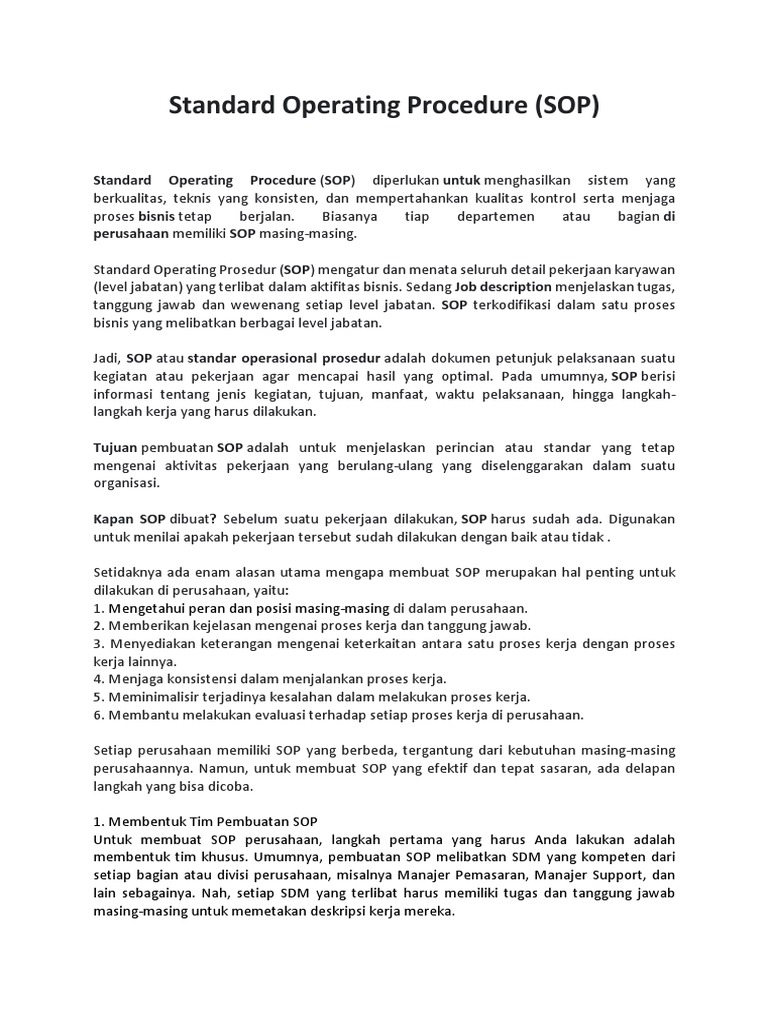 Tujuan pembuatan SOP adalah untuk menjelaskan perincian atau standar yang tetap