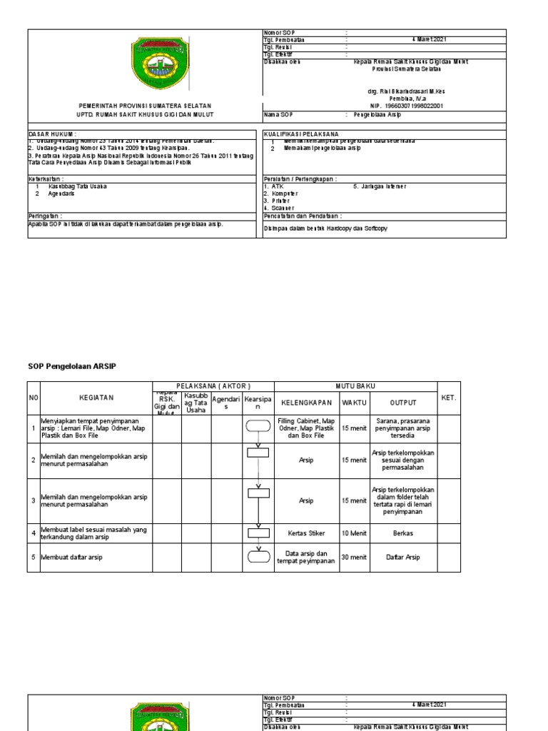 UPTD. RUMAH SAKIT KHUSUS GIGI DAN MULUT Nama SOP : Pengelolaan Arsip