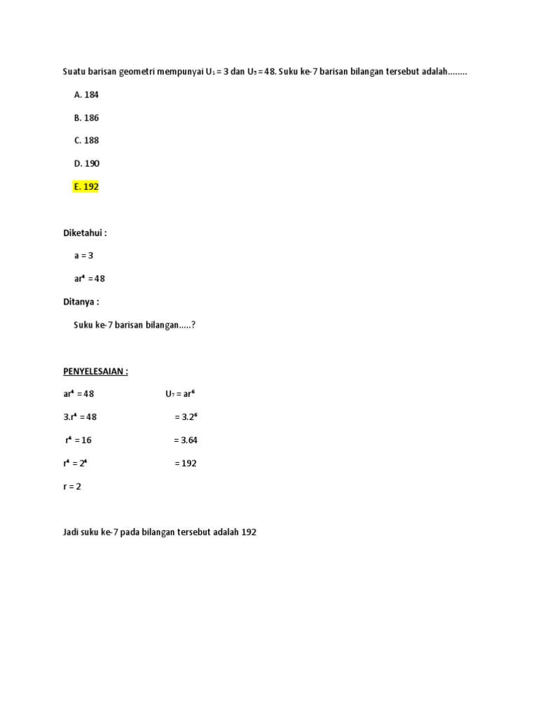Barisan geometri dengan suku pertama 3 dan suku kelima 48 ditanyakan suku ketujuhnya. Dengan rumus ar^n dan menyelesaikan persamaan, didapat r=2 sehingga suku ketujuh adalah 192.