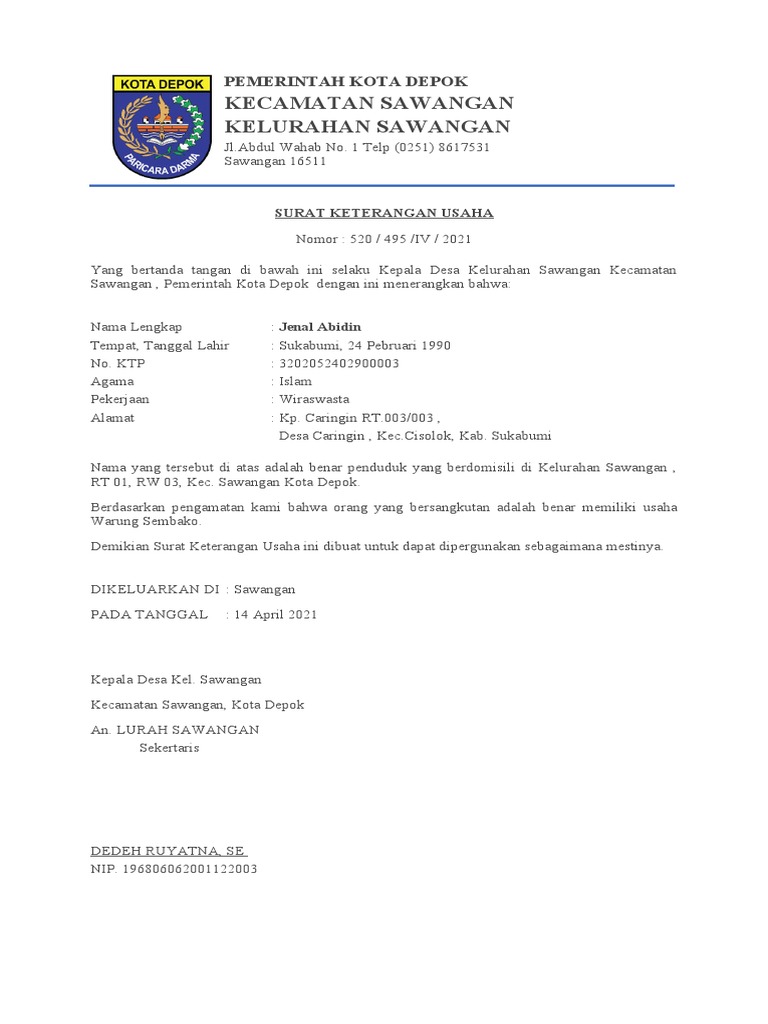 Yang bertanda tangan di bawah ini selaku Kepala Desa Kelurahan Sawangan Kecamatan