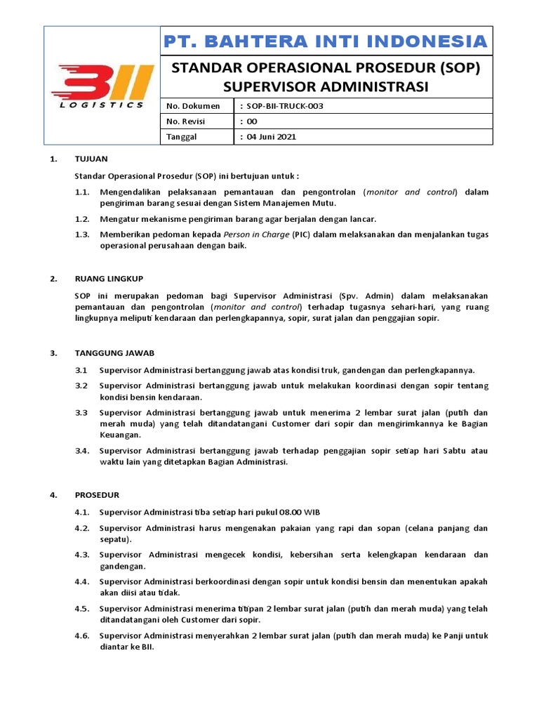 SOP ini merupakan pedoman bagi Supervisor Administrasi (Spv. Admin) dalam melaksanakan