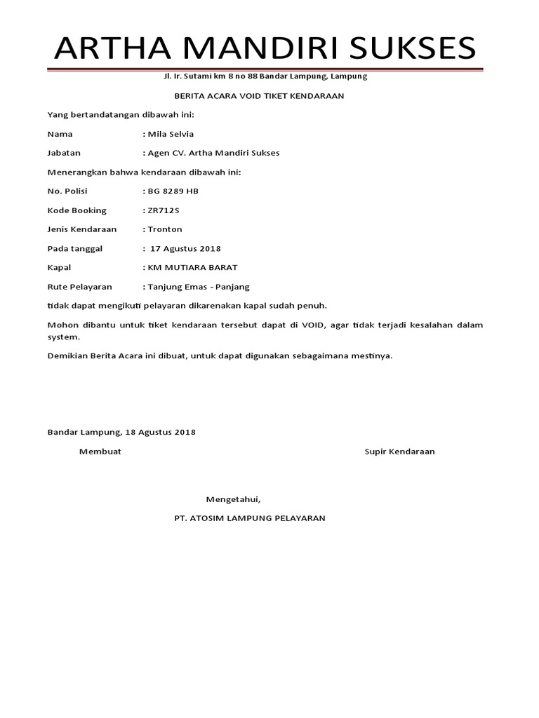 BERITA ACARA VOID TIKET KENDARAAN
