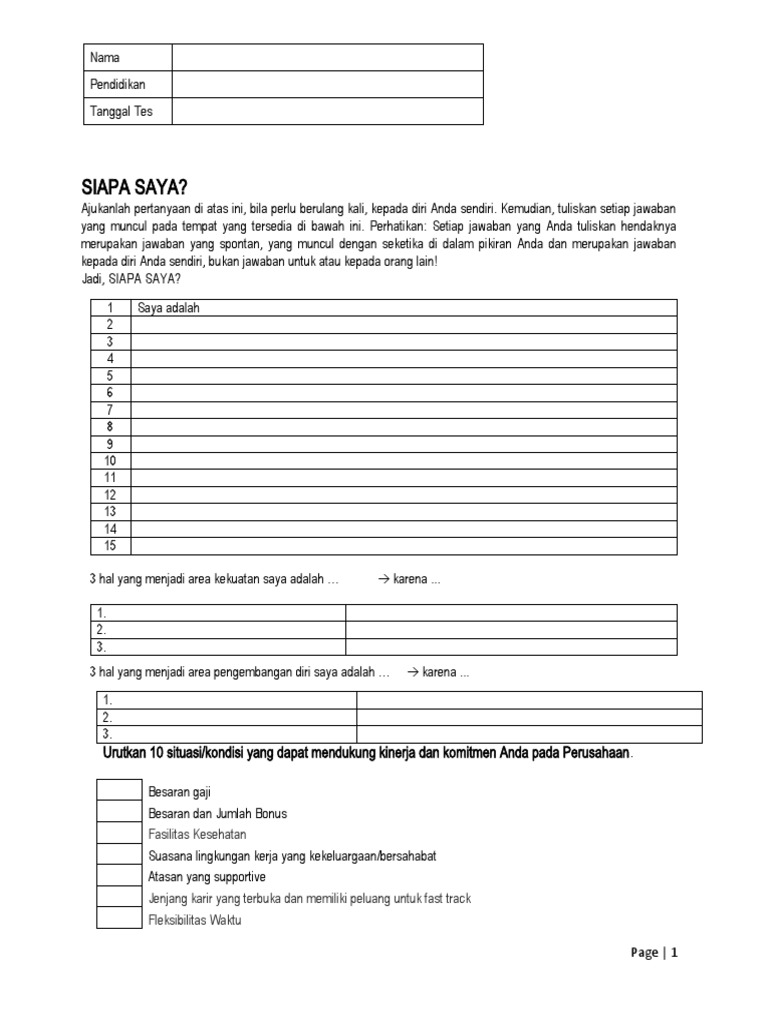 Ajukanlah pertanyaan di atas ini, bila perlu berulang kali, kepada diri Anda sendiri. Kemudian, tuliskan setiap jawaban