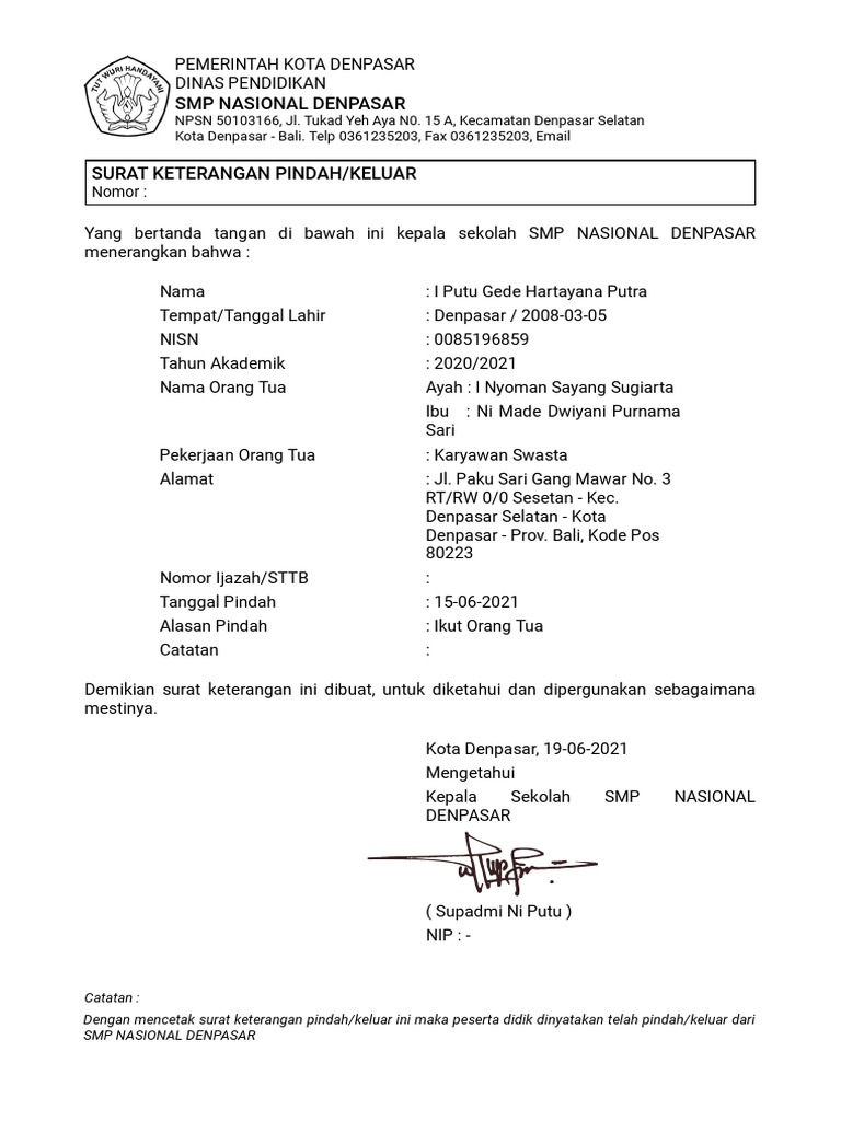 Yang bertanda tangan di bawah ini kepala sekolah SMP NASIONAL DENPASAR