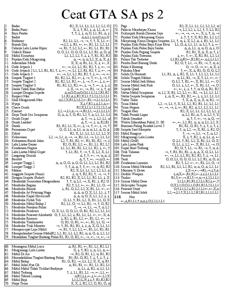 40. Lompat Tinggi 2 ↑, ↑, ∆, ∆, ↑, ↑, ←, →, □, R2, R2 110. Semua Mobil Meledak R2, L2, R1, L1, L2, R2, □, ∆, O, ∆, L2, L1