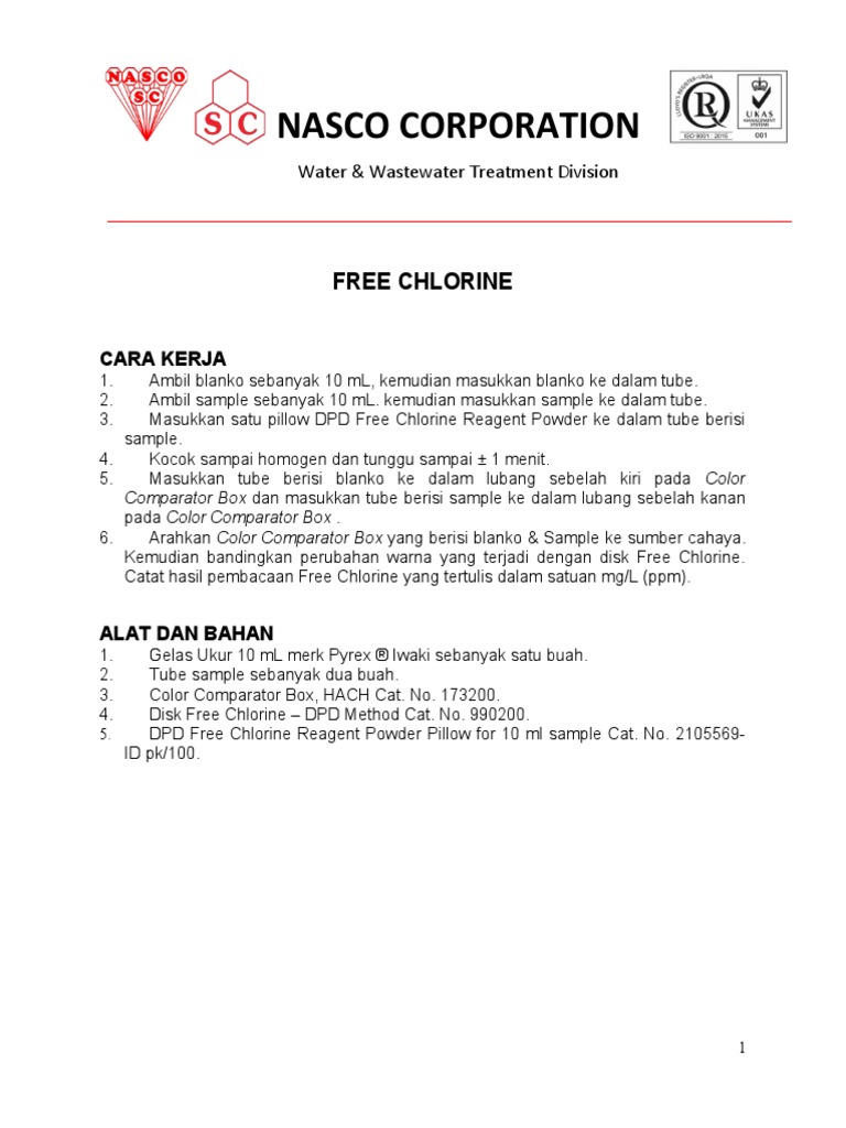 Catat hasil pembacaan Free Chlorine yang tertulis dalam satuan mg/L (ppm).