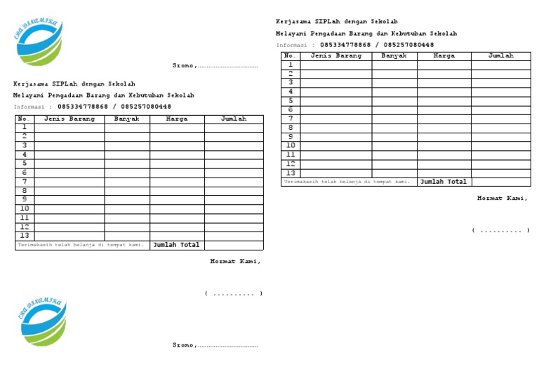7 Terimakasih telah belanja di tempat kami. Jumlah Total
