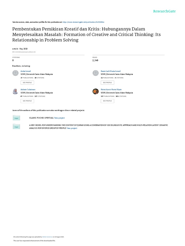masalah (Runco, 2008; Sumarwati dan Jailani, 2011). Di nanti (Che Husain & Tengku Kasim, 2007).