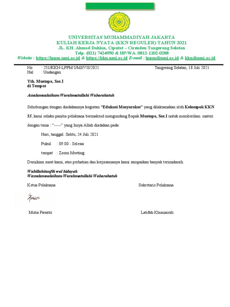 No : 251/KKN-LPPM UMJ/VII/2021 Tangerang Selatan, 18 Juli 2021