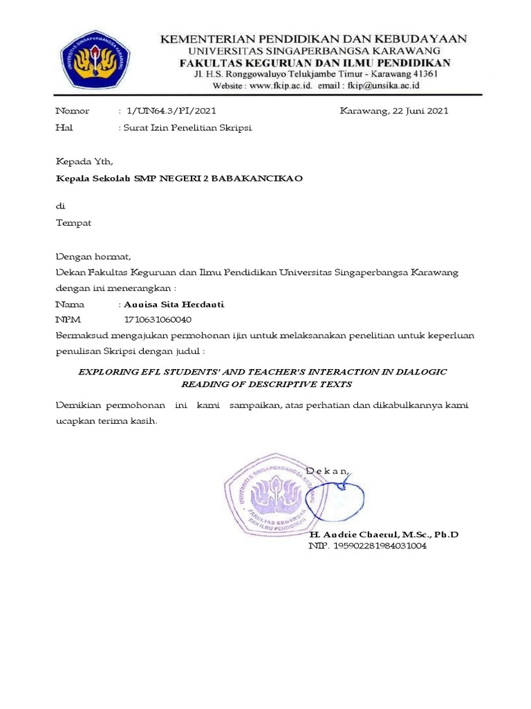 Hal : Surat Izin Penelitian Skripsi