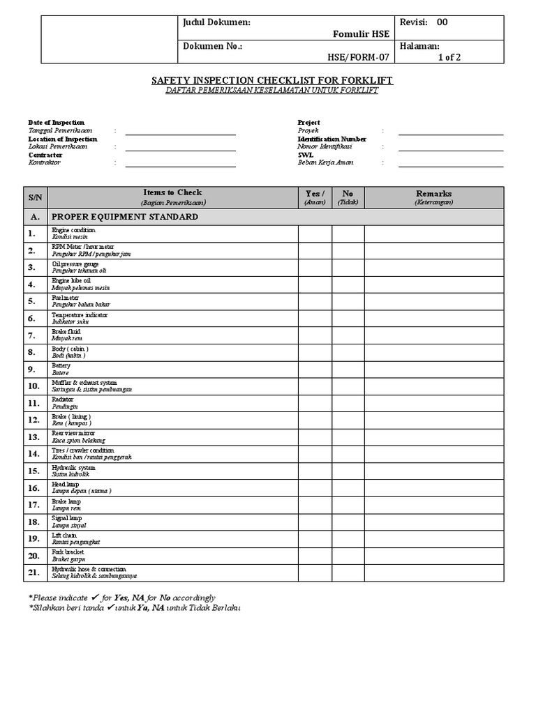 DAFTAR PEMERIKSAAN KESELAMATAN UNTUK FORKLIFT