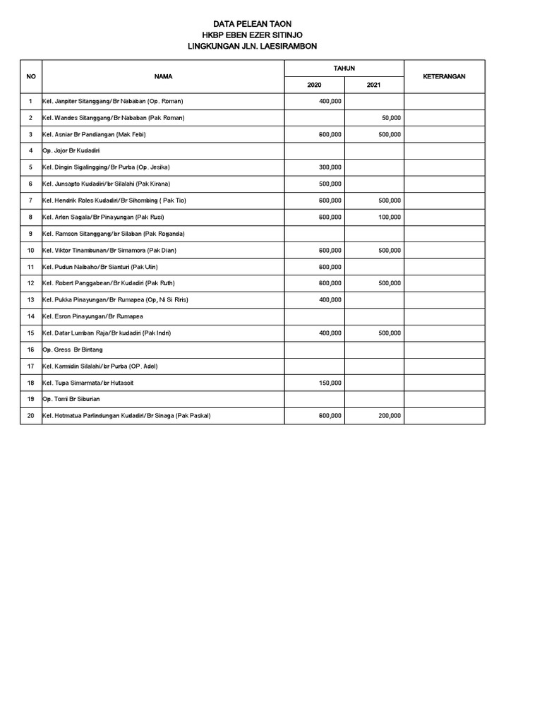 21 Kel. Jannes Siregar/br Siahaan (Pak Cindi) 600,000 200,000
