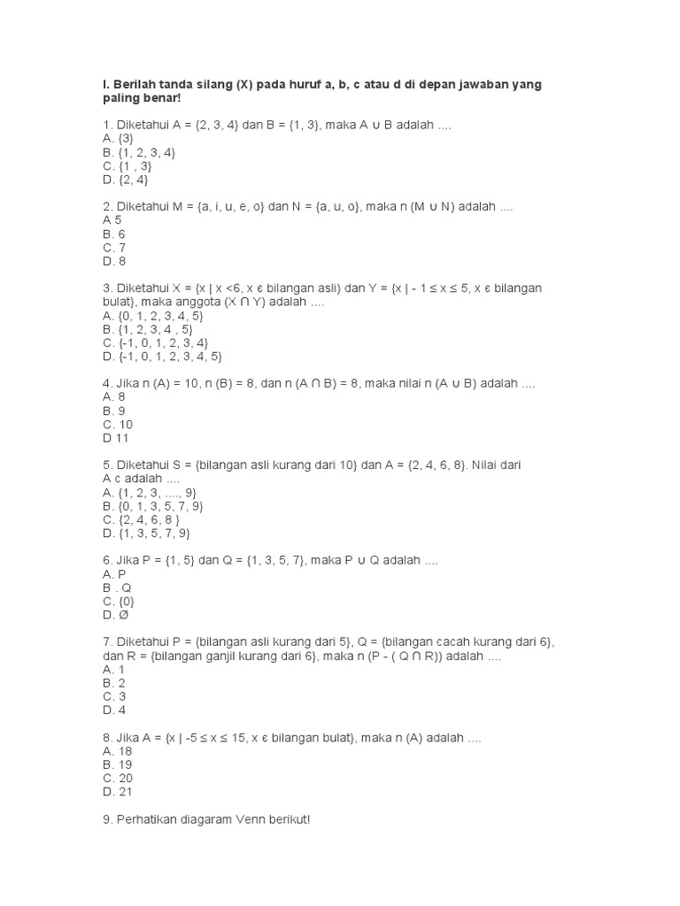 1. Diketahui A = {2, 3, 4} dan B = {1, 3}, maka A ∪ B adalah ....