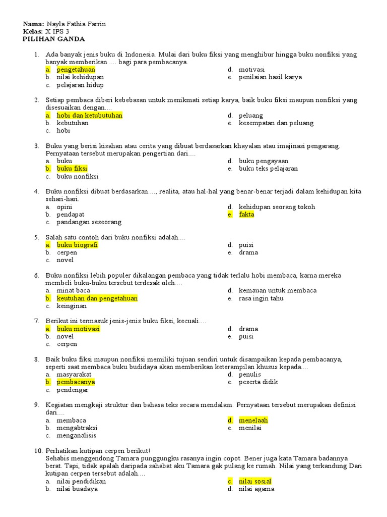 b. nilai kehidupan e. penilaian hasil karya