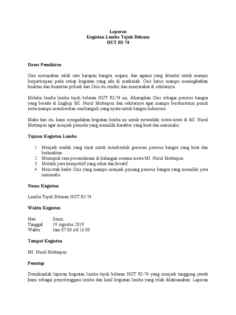 Demikianlah laporan kegiatan lomba tujuh belasan HUT RI-74 yang menjadi tanggung jawab