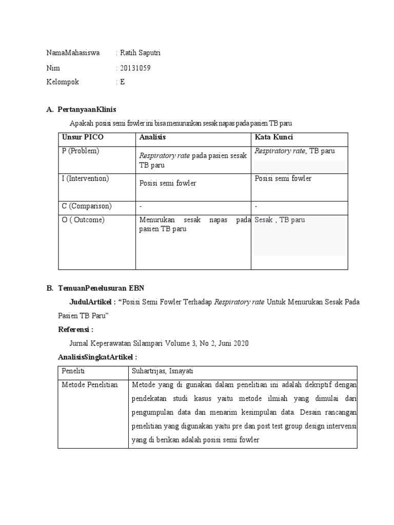JudulArtikel : “Posisi Semi Fowler Terhadap Respiratory rate Untuk Menurukan Sesak Pada