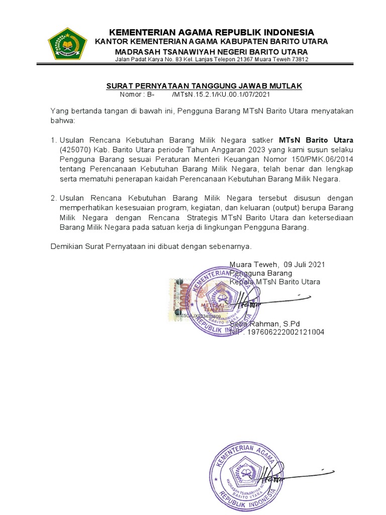 Yang bertanda tangan di bawah ini, Pengguna Barang MTsN Barito Utara menyatakan