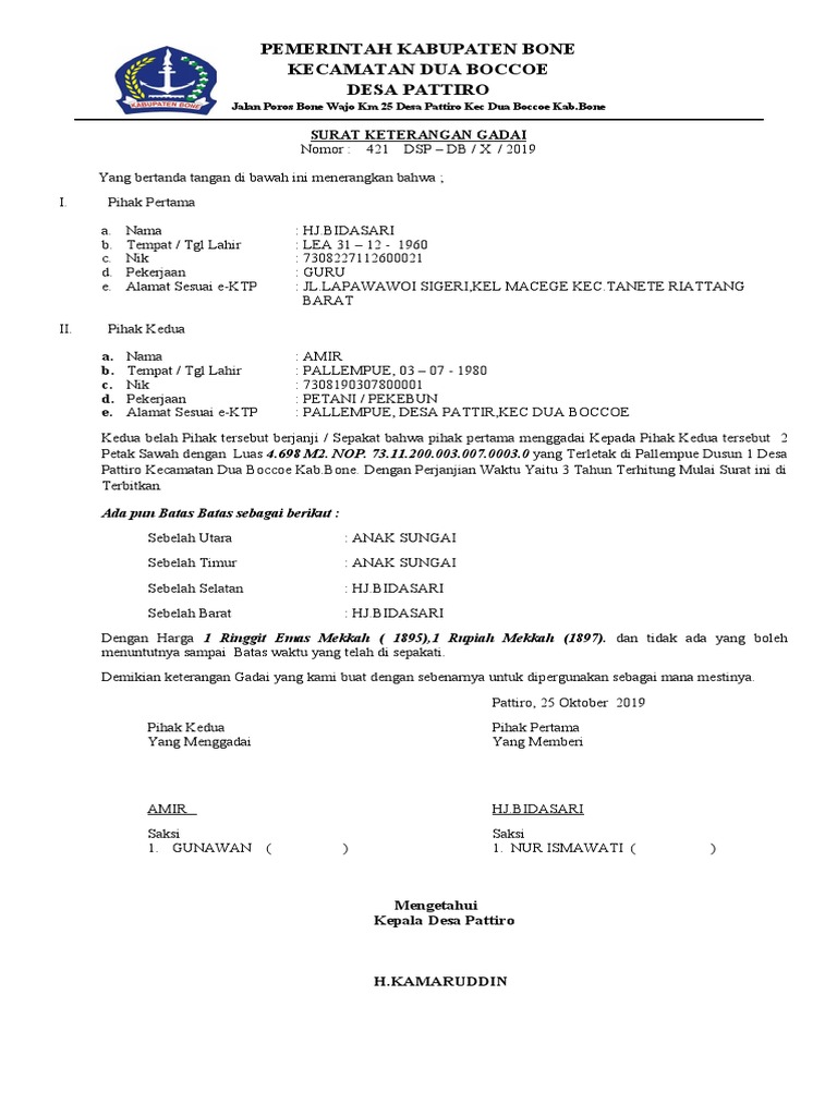Pattiro Kecamatan Dua Boccoe Kab.Bone. Dengan Perjanjian Waktu Yaitu 3 Tahun Terhitung Mulai Surat ini di