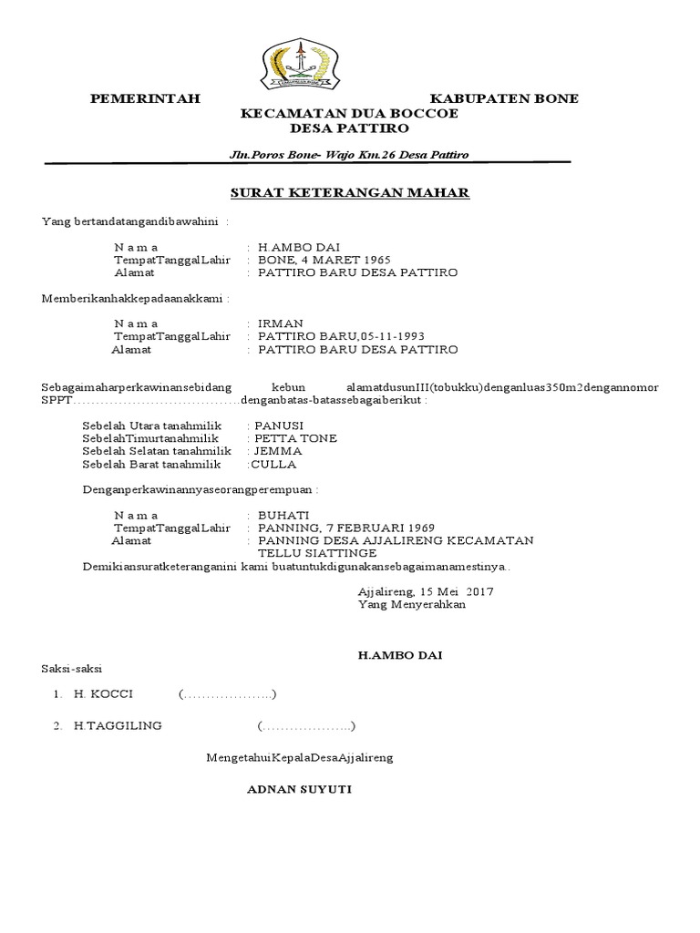 Sebagai mahar perkawinan 1 petak sawah yang terletak di Dusun I Desa Pattiro Kecamatan