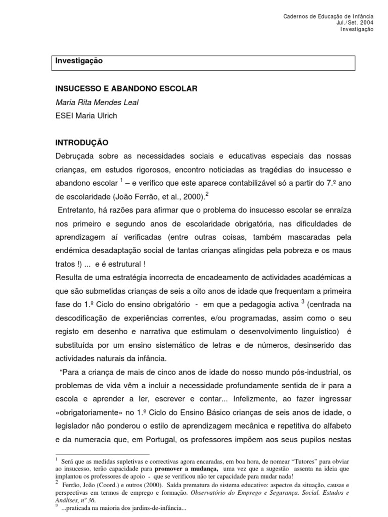 Leal, M.R.M. (2004) Inclusão e escola activa - Investigar e reflectir a educação. ESEI/Maria Ulrich, p. 9.