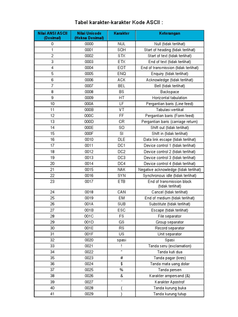 Nilai ANSI ASCII Nilai Unicode Karakter Keterangan