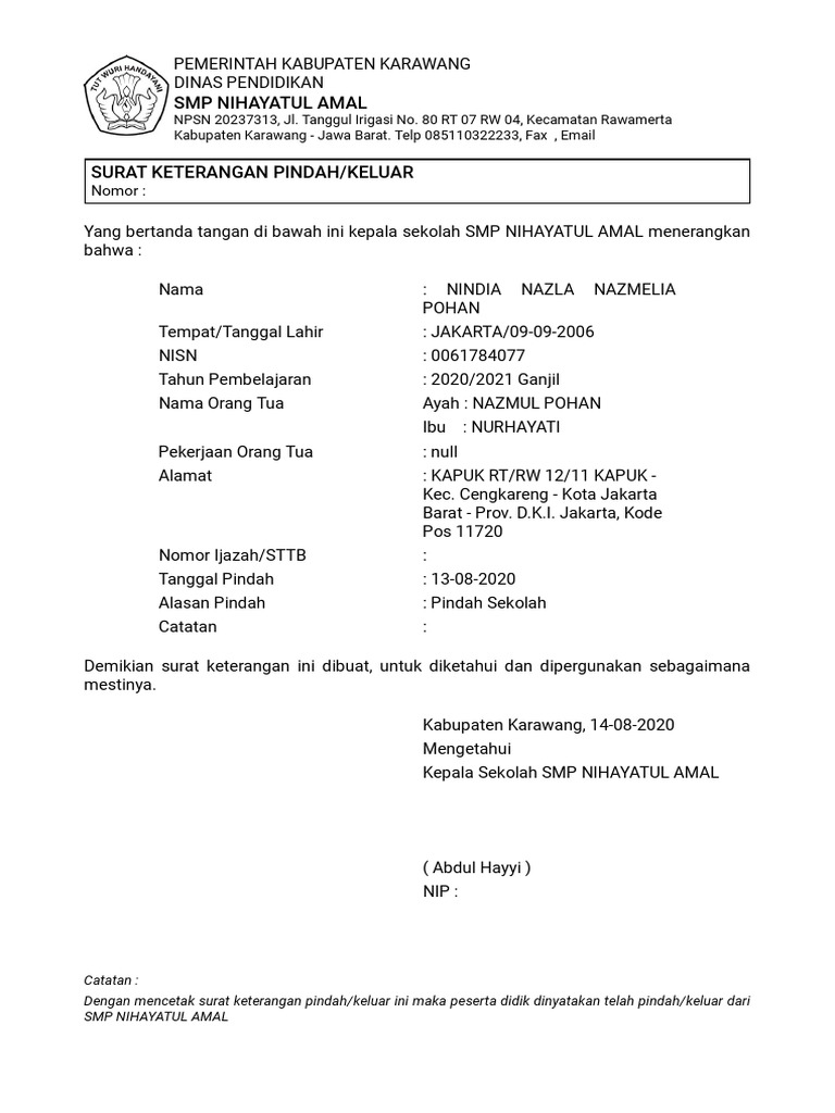 Yang bertanda tangan di bawah ini kepala sekolah SMP NIHAYATUL AMAL menerangkan