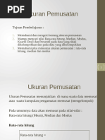 Ada beberapa ukuran pemusatan, atau ukuran kecenderungan pusat antara lain: