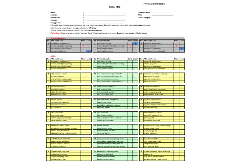 Perhatikan! Setiap soal hanya berisi 2 jawaban (huruf X) yaitu satu jawaban di kolom Most dan satu jawaban di kolom Least