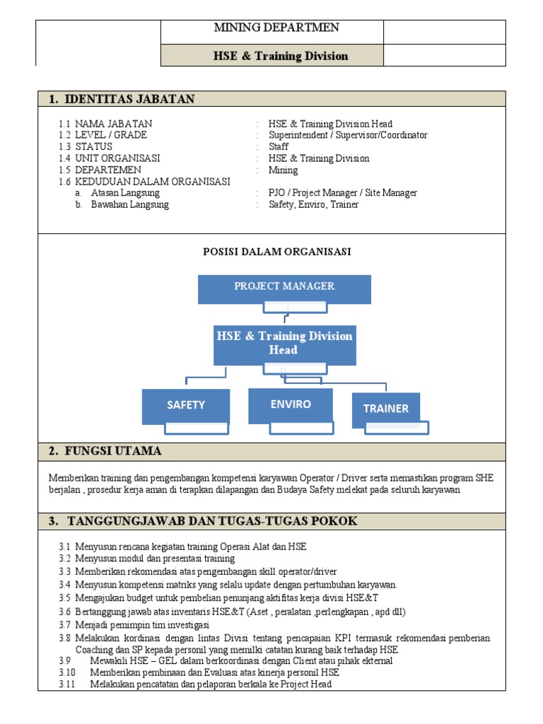 b. Bawahan Langsung : Safety, Enviro, Trainer
