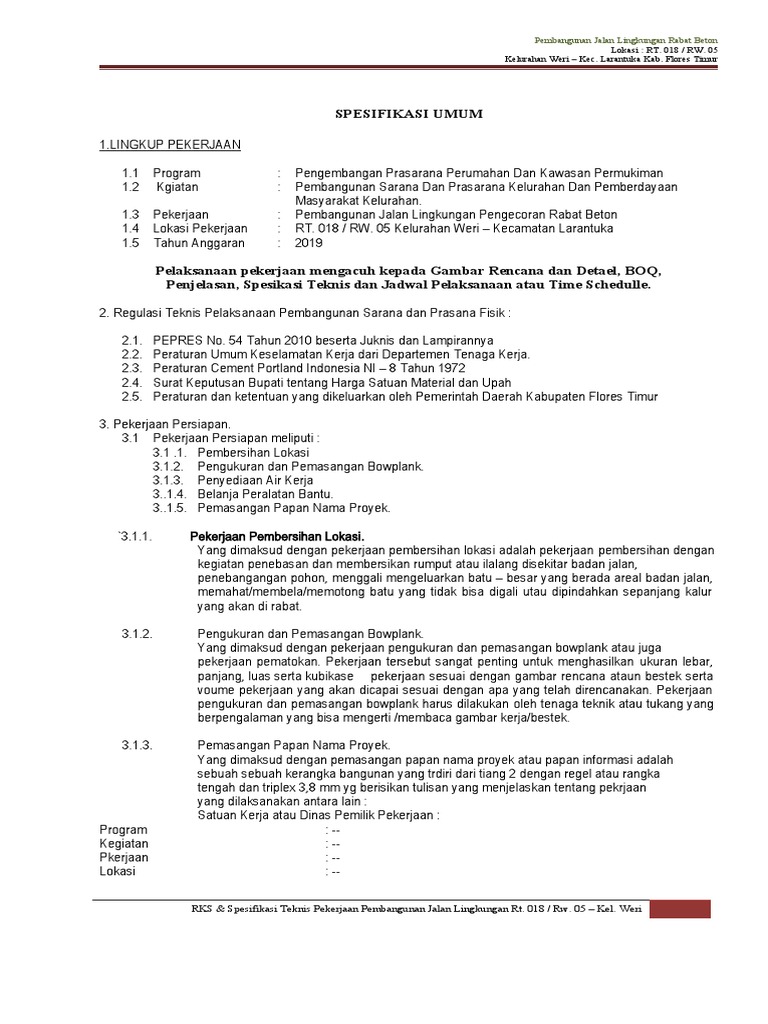 RKS & Spesifikasi Teknis Pekerjaan Pembangunan Jalan Lingkungan Rt. 018 / Rw. 05 – Kel. Weri