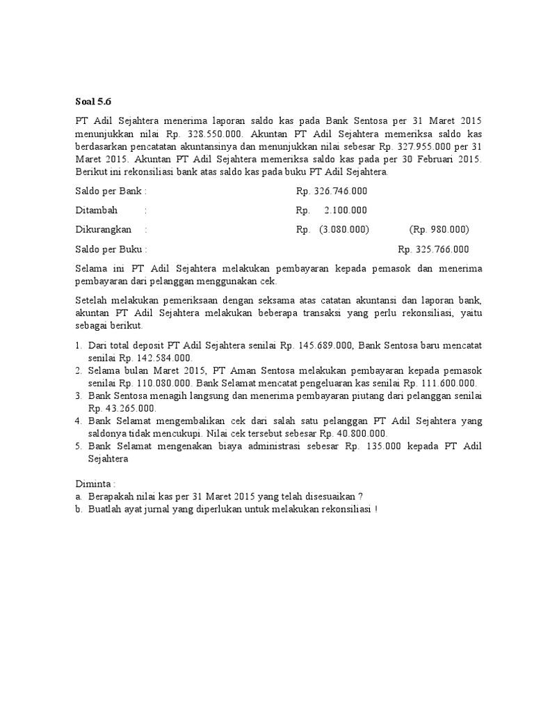 PT Adil Sejahtera menerima laporan saldo kas pada Bank Sentosa per 31 Maret 2015