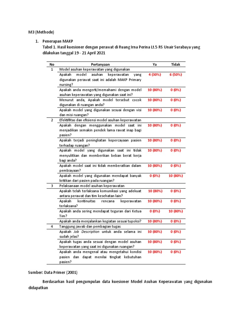Berdasarkan hasil pengumpulan data kuesioner Model Asuhan Keperawatan yang digunakan