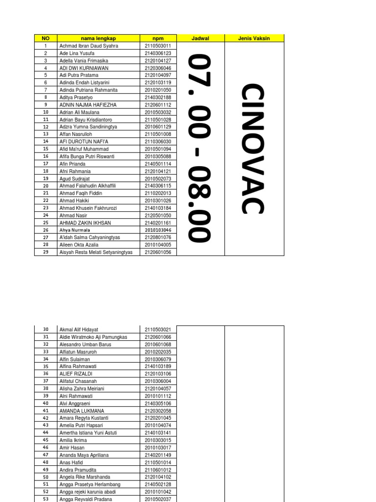 NO nama lengkap npm Jadwal Jenis Vaksin